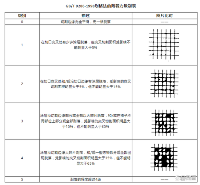 評級方法:在良好照明的環(huán)境下,目視檢查測試面涂層的脫落情況。附著力共分6個等級,從0級到5級涂層附著力依次遞減,5級最差。GB/T 9286-1998劃格法的附著力級別見下表。
